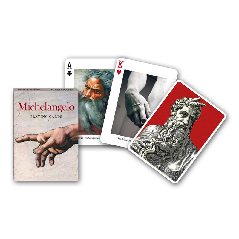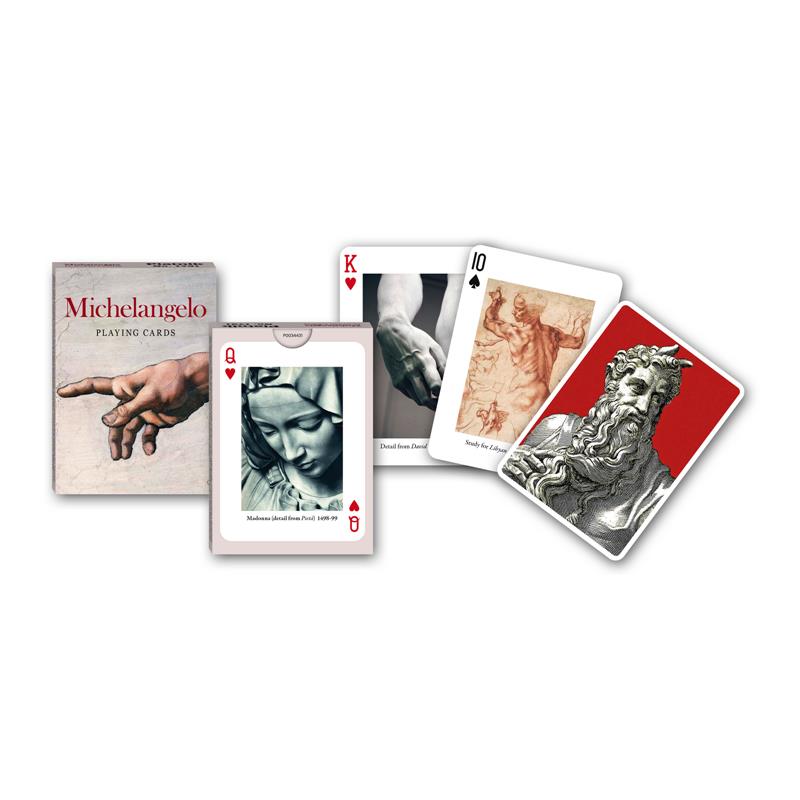Гральні карти Мікеланджело - на зовнішньому та зворотньому боці зображені репродукції творів видатного італійського митця Високого Відродження. Карти виготовлені з високоякісного картону з ламінуванням. Ламінування покращує ковзання та довговічність карт. Чудово підходить для аматорської гри. Розмір карт стандартний, вони ідеально підходять для будь-яких карткових ігор. Колода складається з 52 основних карт, 2-х джокерів та промокарти.