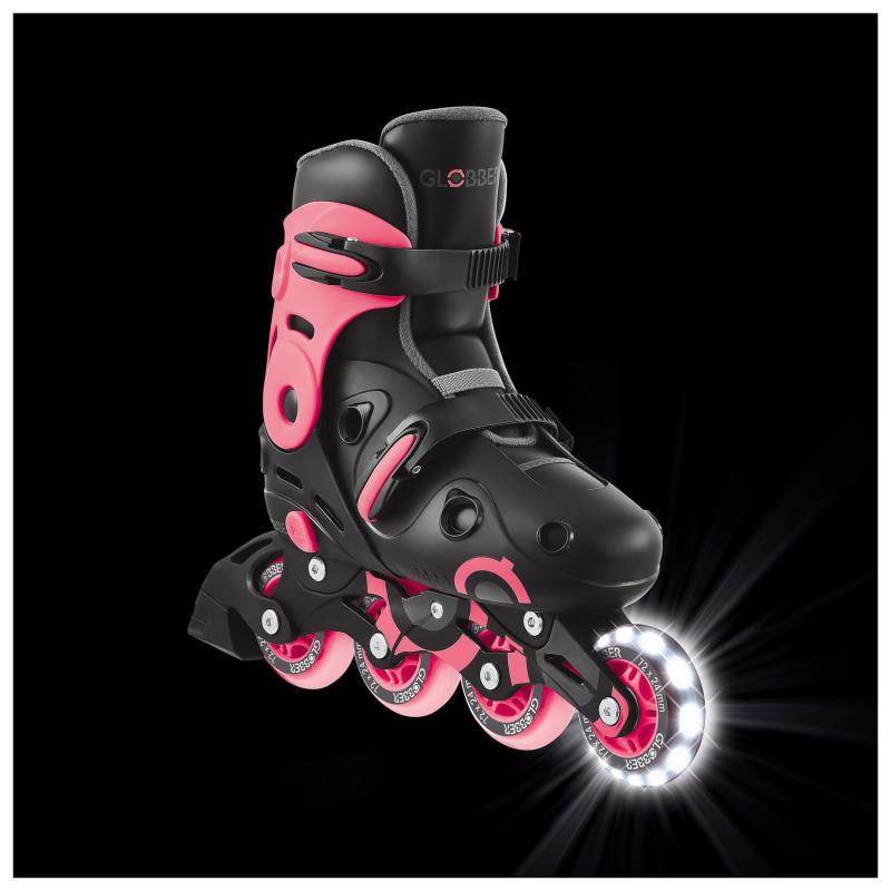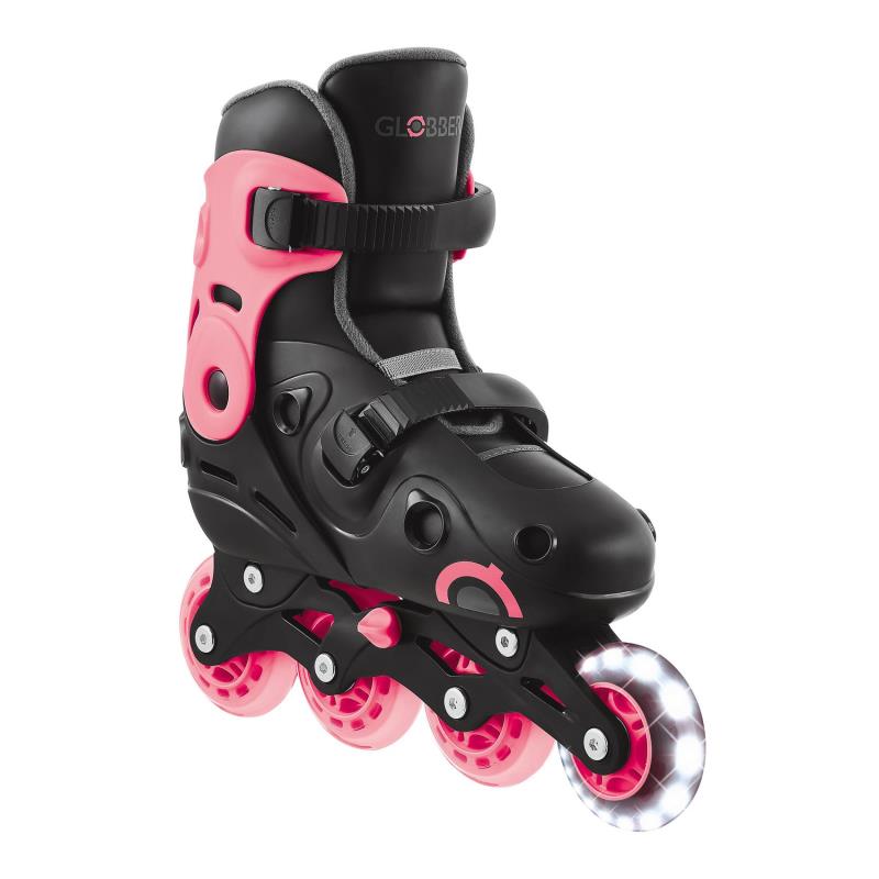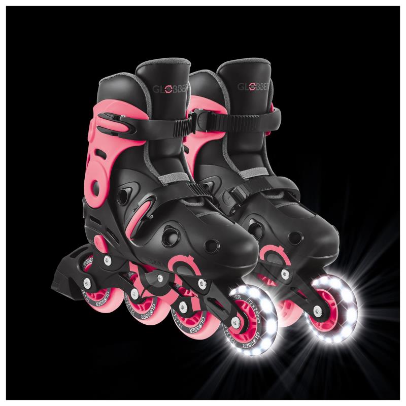 | - безпечні роликові ковзани з підсвічуванням для дітей віком від 5 років з регульованими розмірами: розмір ЄС 34-37. Ексклюзивний дизайн від Globber для дітей-роллерів; - роликові ковзани з підсвічуванням та механізмом регулювання швидкості: збільште опір, щоб уповільнити середні колеса під час катання, що контролює швидкість і допомагає дітям навчитися кататися безпечніше. У міру прогресу дитини зменшуйте опір для звичайного катання; - регульовані роликові ковзани для дітей з кнопкою, що легко натискається, та ремінцями, що легко застібаються, для регулювання довжини та щільності черевика ковзана для комфортного користування; - черевики для роликових ковзанів виготовлені з матового оксамиту та матеріалу EVA для комфортного катання для дітей; - чотири високоякісні литі поліуретанових колеса діаметром 72 мм (24 мм завширшки) встановлені на підшипниках ABEC 9. Передні колеса з підсвічуванням блимають білими світлодіодами без використання батарейок; - заднє гальмо з термопластичної гуми забезпечує безпечне катання та зупинку. Предбачене тільки для правого черевика, з'ємне. |