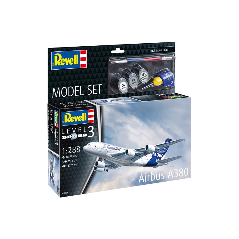 Модель Airbus A380-800 у масштабі 1:288 з 48 деталей (рівень 3) та всіма аксесуарами, необхідними для складання!