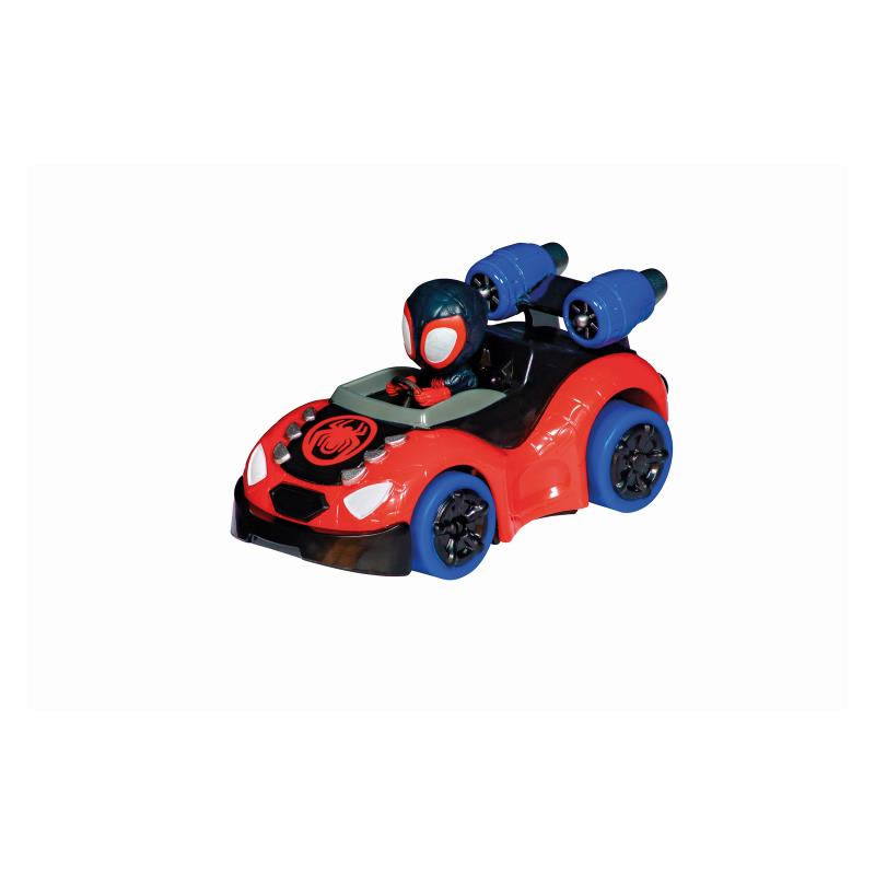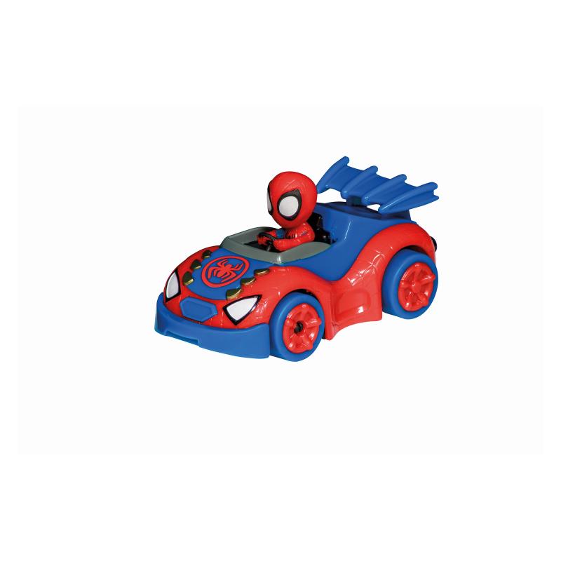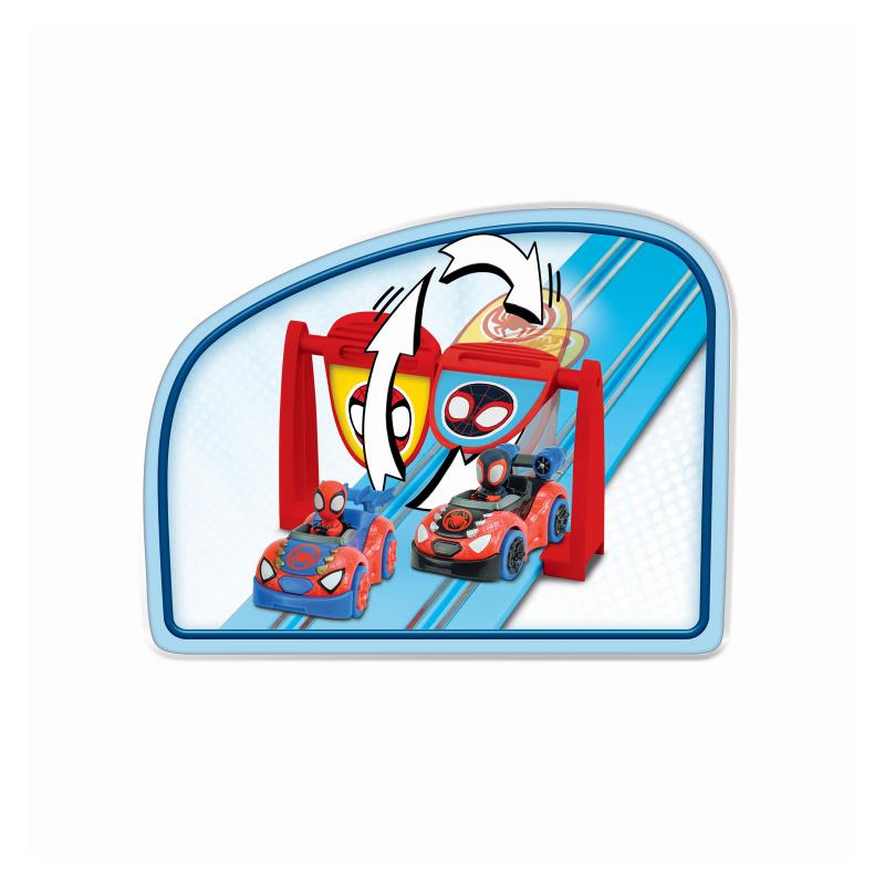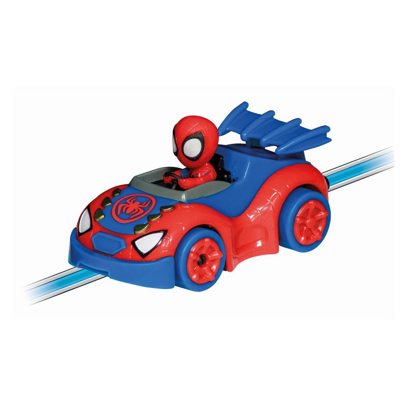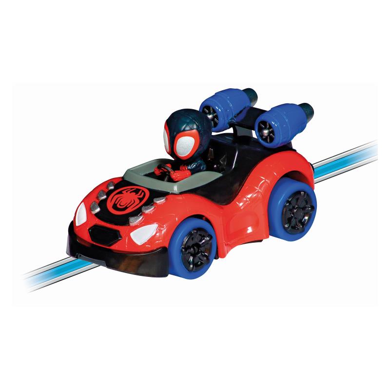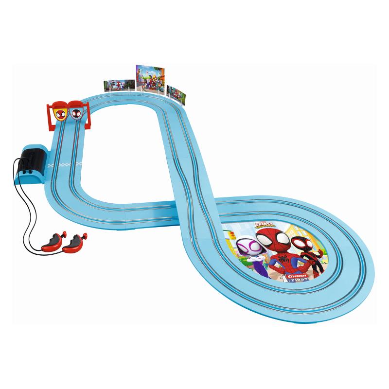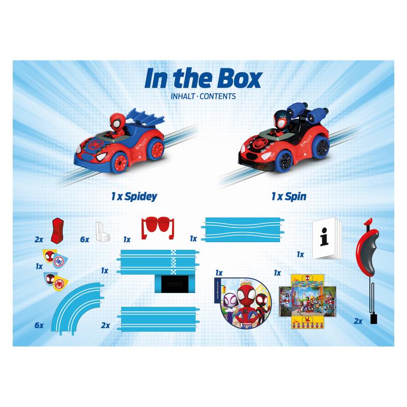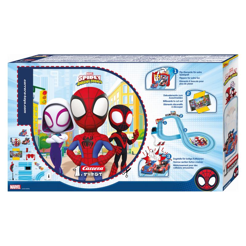Розваги для маленьких фанатів Людини-павука Пітера Паркера. Пітер Паркер приєднується до свого друга Майлза Моралеса – або Спін – із серії «Павук та його супердрузі» та по-справжньому натискає на газ на 2,9-метровій трасі. Гоночна траса Carrera FIRST пропонує юним гонщикам серйозні випробування – включаючи швидкістні прямі, повороти, вузькі ділянки – та море задоволення! Перекидні елементи мають привабливі емблеми Павука на яскраво-синій трасі. Гру збагачують декоративні елементи з мотивами із серії.
