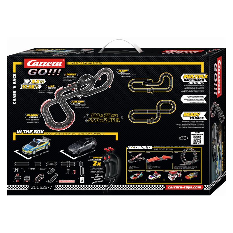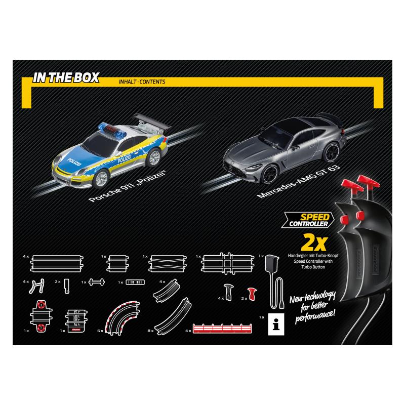 Погоня на гоночній трасі Carrera. Дія відбувається на трасі Carrera GO!!! «Переслідування та гонка», де «поліцейський» Porsche 911 переслідує AMG Mercedes GT на 5,3-метровій трасі. Надзвичайно вражаюча траса ставить перед юними водіями низку викликів – перехрестя, естакади, петлі, вузькі ділянки та швидкісні прямі, на яких захоплює дух. Розваги та адреналін гарантовані! Для ще більшої швидкості турбопідсилювачі на ручних контролерах роблять цих двох суперників практично непереможними!
