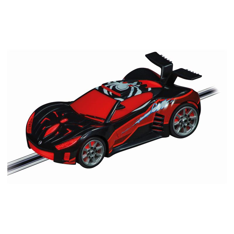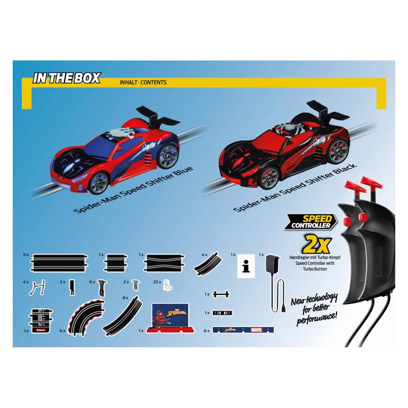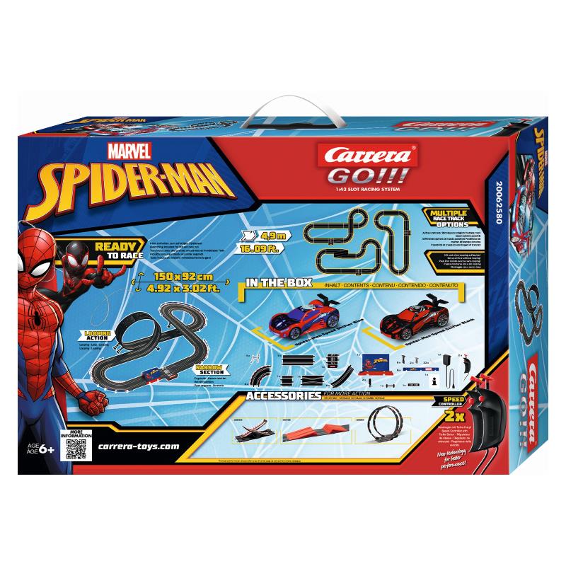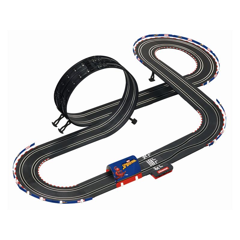Людина-павук натискає на газ у Carrera GO!!! "Спайдермен-гонщик". Людина-павук у червоному кольорі змагається зі своїм суперником у чорному - складна дуель на трасі довжиною 4,9 метра гарантована. Петля забезпечує необхідну дозу аадреналіну, повний газ - це абсолютно нормально на прямих відрізках, а складні повороти вимагають від водіїв максимальної майстерності. Більше того, юним гонщикам доведеться докласти зусиль щоб заявити про себе і першими подолати складну вузьку ділянку та здобути перемогу в дуелі. Для додаткової інтриги ручні контролери, що входять до комплекту, оснащені турбо кнопкою. Лише ті, хто зберігає самовладання будуть переможцями.