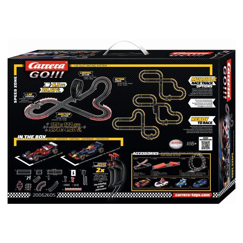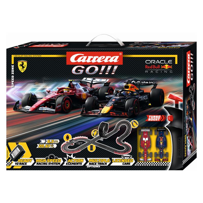 Автотрек Carrera GO!!! Зона швидкості об'єднує двох найвидатніших ікон автоспорту: Макса Ферстаппена на боліді Oracle Red Bull Racing RB21 "M. Verstappen, №1" та Льюїса Хемілтона на Ferrari SF-25 "L. Hamilton, №44".Юні гонщики зможуть продемонструвати свої навички на вражаючій трасі довжиною 6,3 метра - з високошвидкісними прямими, крутими поворотами та петлею, гоночна траса забезпечує захоплюючі дії, сповнені адреналіну. Деталізовані транспортні засоби та різноманітні елементи траси переносять захоплюючу атмосферу Формули-1 прямо у ваш дім. Тепер настав час натиснути на газ і довести, хто найшвидший на трасі!
